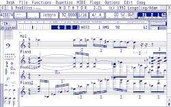 Anfang 1960 begann man mit den ersten Versuchen, Notensatz mithilfe des Computers zu verwirklichen. Die frühe Geschichte des Notensatzprogramms ist dabei eng verknüpft mit der Entwicklung der Computer-Hardware. So war in den Anfangsjahren die Nutzung von Computern wenigen Firmen und Forschungseinrichtungen vorbehalten; für Notensatz eingesetzte Geräte wie die PDP-10 füllten ganze Räume. Zu den frühsten Programmen am Markt zählen MusE (A-R Edition) und Amadeus (von Kurt Maas vertrieben).[1] Letzteres basierte auf einer PDP-11 sowie in späteren Jahren zusätzlich einem Atari als Grafikterminal und kostete als Gesamtsystem anfangs annähernd 100.000 DM.[2] Ab Mitte der 1980er waren der Atari ST sowie der Acorn RISC gängige Umgebungen zur Programmierung von Notensoftware.
