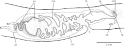 Schematische Zeichnung des Kopulationsorgans von Notogynaphallia nawei. Sie zeigt Prostata-Vesikel (pv), die sich zum männlichen Atrium genitale hin öffnen (am), und die Ovovitellin-Kanäle (od), die in einem gemeinsamen Ovovitellin-Kanal (cod) hinter dem weiblichen Atrium genitale (fa) zusammenlaufen.