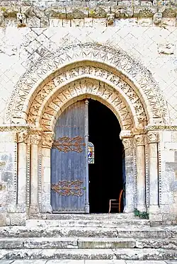 Der Mittelabschnitt der Fassade wird noch einmal knapp unter seiner halben Höhe durch ein Kraggesims waagerecht unterteilt, das von skulptierten Kragsteinen gestützt wird. Das dreifach gestufte Archivoltenportal besitzt leicht angespitzte Bögen mit rechtwinkligem Querschnitt, deren Keilsteine einzeln in radialer Anordnung skulptiert sind. Die Bögen stehen auf dicken profilierten Kämpfern, die seitlich des Portals als Gesims weitergeführt sind und noch über die Mauervorlagen reichen. Die Kämpfer ruhen auf skulptierten Kapitellen. Darunter stehen auf jeder Seite drei zylindrische Säulen, deren innere fast doppelt so dick sind wie die anderen. Die Säulen werden begleitet von ornamentierten Mauerecken.