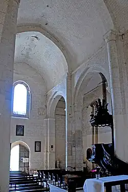 Die meisten heute erhaltenen Bauteile, wie die Fassade und das Portal, aber auch das weitgehend zerstörte Kopfende mit den drei Apsiden, sind im Stil des Übergangs von der Vorromanik zur Romanik erbaut worden, man kann annehmen unter Hugo IX. von Lusignan und Herr von Château-Larcher von 1196 bis 1223.