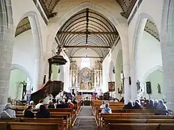 Das dreischiffige Langhaus ist in fünf Joche gegliedert. Hohe spitzbogige Arkaden, die auf Säulen ohne Kapitelle aufliegen, trennen das Mittelschiff von den beiden Seitenschiffen, ein weiter Spitzbogen öffnet es zum Chor.