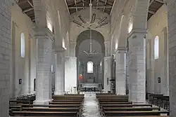 Das dreischiffige Langhaus, das im 15. Jahrhundert erneuert wurde, wird von einer Holzdecke gedeckt. Breite Arkaden, die auf oktogonalen Pfeilern ruhen, öffnen das Mittelschiff zu den beiden Seitenschiffen. An das Querhaus schließen sich Kapellen mit quadratischem Grundriss an. Die Vierung überspannt eine auf Trompen aufliegende Kuppel. Der einjochige Chor schließt mit einer halbrunden Apsis.