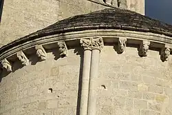 Der Glockenturm, der sich über der Vierung erhebt, besteht aus einem quadratischen Unterbau und einem oktogonalen Obergeschoss. Das Turmoktogon wird von schmalen Öffnungen durchbrochen, die von rundbogigen Arkaden und schlanken Halbsäulen gerahmt werden. Die halbrunde Apsis wird von Steinplatten gedeckt. Unter dem Dachansatz verläuft ein Gesims, das auf skulptierten Kragsteinen und Doppelsäulen aufliegt. Die Säulen, deren Kapitelle mit Tierdarstellungen versehen sind, gehen auf der Höhe der Fensteröffnungen in flache Strebepfeiler über.
