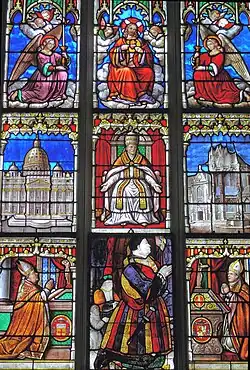 ![]() Das Fenster mit der Darstellung des Judaskusses stammt vermutlich aus dem Jahr 1540. Rechts und links werden am unteren Bildrand zwei Priester als Stifter dargestellt. Im Maßwerk sieht man Engel und in der Mitte ein Wappen.[19]