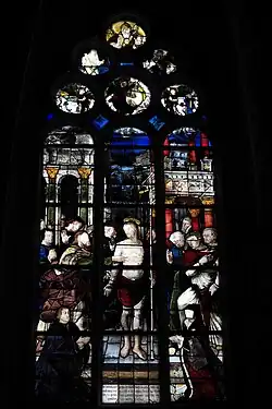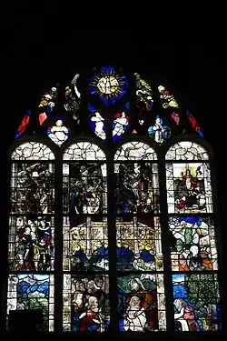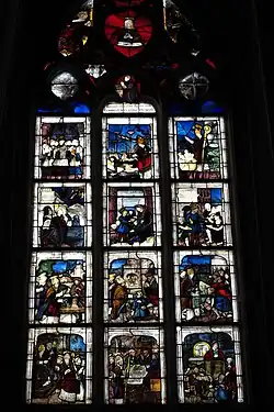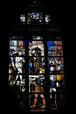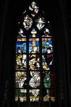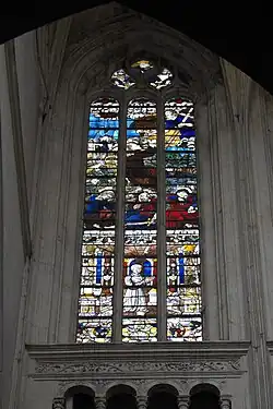 ![]() Das Fenster wurde in der zweiten Hälfte des 19. Jahrhunderts neu zusammengesetzt. Im Zentrum ist die Auferweckung des Lazarus dargestellt. Die Szene wurde vermutlich im frühen 16. Jahrhundert von Robert Courtois geschaffen. Andere Szenen stellen die Kreuztragung, die Kreuzigung, die Kreuzabnahme und die Auferstehung Christi dar. Auf der mittleren Scheibe der linken Lanzette kann man Jesus vor Pilatus erkennen.[15] |