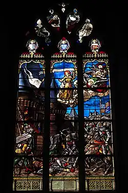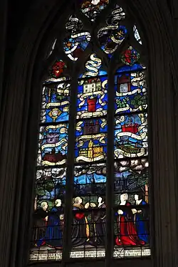 ![]() Auf einem Fenster ist die Belagerung von La Ferté-Bernard durch englische Truppen während des Hundertjährigen Krieges dargestellt, die nach dem damaligen Glauben durch die Hilfe der Jungfrau Maria beendet werden konnte. Bereits Ende des 15. Jahrhunderts stifteten die Bewohner von La Ferté-Bernard aus Dankbarkeit ein Fenster zu diesem Ereignis, von dem heute nur noch das Maßwerk erhalten ist. Im Jahr 1877 erhielt Eugène Hucher den Auftrag, das Fenster wieder zu vervollständigen.[25] |