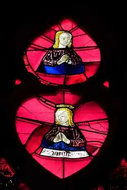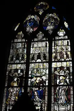 ![]() Das Fenster wurde im 19. Jahrhundert aus verschiedenen Fragmenten zusammengesetzt. Von der ursprünglichen Verglasung sind nur die Scheiben im Maßwerk erhalten. Sie stammen aus dem späten 15. Jahrhundert und wurden von Robert Courtois geschaffen. Links ist Gottvater dargestellt, rechts die Krönung Mariens. Die Scheiben mit der Darstellung des Marientodes stammen ebenfalls aus dem späten 15. Jahrhundert.[20] |