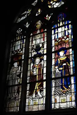 ![]() Das Georgsfenster wurde vermutlich zwischen 1481 und 1483 geschaffen. Damals war der französische König Ludwig XI. Grundherr von La Ferté-Bernard. An ihn und seine Gemahlin Charlotte von Savoyen erinnern die beiden Wappen in den Spitzen der rechten und linken Lanzette. Beide sind auch in der mittleren Lanzette über dem heiligen Georg, der den Drachen besiegt, dargestellt. Die seitlichen Lanzetten schildern Szenen seines Martyriums.[21] |