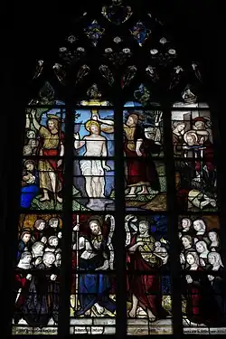 ![]() Das Fenster wurde 1534 ausgeführt und 1858 restauriert und ergänzt. Im oberen Teil sind die Taufe Jesu, die Predigt Johannes des Täufers in der Wüste und seine Enthauptung dargestellt. Im unteren Teil sieht man Stifter und in der Mitte den Apostel Jakobus und Johannes den Täufer mit dem Lamm Gottes.[10] |