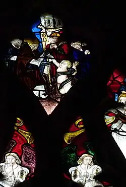 ![]() Das zentrale Chorfenster mit der Darstellung der Beweinung Christi stammt aus dem späten 16. Jahrhundert. Das Maßwerk wurde durch Scheiben aus dem Ende des 15. Jahrhunderts ergänzt, auf denen Gottvater und zwei Engel mit den Leidenswerkzeugen dargestellt sind.[4] |