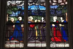 ![]() Das Fenster wurde von François de Lorraine, dem Herzog von Guise, und seiner Gemahlin Anna d’Este in Auftrag gegeben und um 1600 ausgeführt. Die Stifter sind auf den unteren Scheiben dargestellt, hinter ihnen ihre Schutzpatrone, der heilige Franz von Assisi und die heilige Anna. Ihre Wappen, die von der Kette des Ordens des heiligen Michael umrahmt werden, sieht man im Maßwerk. Die mittlere Lanzette zeigt Christus am Kreuz, zu dessen Füßen Maria Magdalena kauert. Auf der linken Lanzette sieht man Maria und auf der rechten Lanzette den Apostel Johannes.[22] |