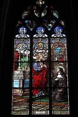![]() Von dem Fenster, das zwischen 1530 und 1540 ausgeführt wurde, sind nur noch die Scheiben im Maßwerk erhalten. Die Szene, in der Jesus der Nonne Margareta Maria Alacoque erscheint und auf sein Herz zeigt, wird Eugène Hucher zugeschrieben und wurde vermutlich in der Glasmalereiwerkstatt der Karmelitinnen von Le Mans hergestellt.[11] |