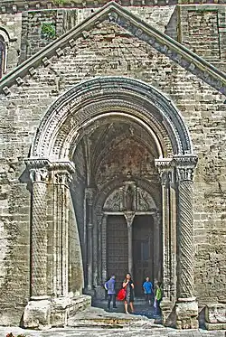 In der Fassadenmitte öffnet sich vier Stufen über dem Bodenniveau das große rechteckige Westportal mit einer zweiflügeligen Tür. Es wird umschlossen von einer Archivolte, die allseitig in Wandrückversätze eingelassen ist. Diese besteht seitlich aus sehr schlanken leicht nach oben konisch zulaufenden weißen Säulen, die mit floral skulptierten Kapitellen, hohen profilierten Kämpfern und Basen ausgestattet sind. Die sehr hohen scharfkantigen Sockel unter den Basen deuten auf eine Wiederverwendung der Säulen hin. Hinter den Säulen treten seitlich in die Türöffnung Wandstreifen hervor deren schmale Sichtseiten mit pflanzlichen Ornamenten dekoriert und deren Laibungsseite mit senkrechten Rillen profiliert sind. Das Kämpferprofil über den Kapitellen setzt sich auch darüber fort. In der Mitte der Türöffnung wurde eine weitere weiße Säule freistehend und ebenso zurücktretend installiert, deutlich dicker und länger als die seitlichen aber ähnlich ausgerüstet. Das Kapitel weist pflanzliche Skulptur auf, wie auch die von Masken. Auf den Kämpfern der Türlaibungen und der Mittelsäule liegt ein ebenfalls weißer und relativ schmaler Sturzbalken auf. Dieser trägt oberflächenbündig ein glatt gemauertes halbrundes Bogenfeld. Das wird wandbündig vortretend vom Archivoltenbogen überfangen, der auf beiden Seiten auf den Kämpfern der seitlichen Kapitelle aufsteht. Seine Außenseite ist mit einem kleinen länglichen floralen Motiv, das sich in kurzen Abständen wiederholt, strahlenförmig dekoriert. Dieser Schmuckstreifen wird beidseitig von schlanken Profilen begleitet.