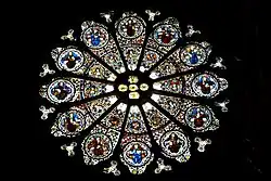 Die äußeren Medaillons der Rosette sind den Aposteln gewidmet. Den Platz in der Mitte oben nimmt Gottvater ein, umgeben von Maria (links) und dem Apostel Petrus (rechts). Auf den inneren Medaillons sind musizierende Engel dargestellt, unten die Wappen des Gouverneurs der Dauphiné, Geoffroy le Mingre, des Domkapitels und des Erzbischofs Michel de Perellos (1378–1427), der die Restaurierung der Bleiglasfenster finanzierte.