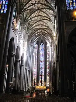 Der fünfjochige Chor beherbergte im 14. Jahrhundert ein Chorgestühl mit 84 Sitzen für die Chorherren. Die farbig verglasten Fenster des Chorpolygons in der Kirche fallen durch außergewöhnlich schlanke Proportionen auf. Ihre Gestaltung ist auf den Rosenkranz und auf die lokale Geschichte bezogen. Die vierzehn Glasmalereien in den Seitenschiffen erinnern an die Kreuzwegstationen. Triforien unter den Obergadenfenstern gliedern das Kirchenschiff.