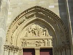 Der Haupteingang der Stiftskirche, ist Maria und ihrer Aufnahme in den Himmel geweiht[11]. Das Marienportal gilt als ein Meisterwerk der westlichen Bildhauerei. Es besteht aus zwei Teilen, die im Abstand von zehn bis fünfzehn Jahren entworfen wurden. Der untere Teil, unterhalb der Sturzbasis, muss sehr kurz nach dem Auferstehungsportal ausgeführt worden sein. Der gesamte obere Teil (Gewölbe und Tympanon) ist wesentlich später entstanden. Es ähnelt dem der Jungfrau Maria gewidmeten Portal der Kathedrale von Senlis. Bei der Restaurierung des Portals im Jahr 1998 wurden Fragmente der Polychromie freigelegt. Die Farben Rot, Grün und Blau herrschen in der Komposition vor.
