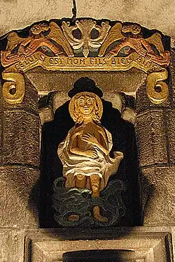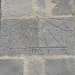 Auf dem breiten Wandstück zwischen den Fenstern ist ein flaches Relief aufgebracht, das aber nichts mit einer Sonnenuhr zu tun hat. In einem doppelten Kreisring sind rundum die römischen Ziffern I bis XII eingraviert. Der innere Kreisring wird ausgefüllt mit einer zwölfstrahligen Sonne, deren spitz zulaufende Strahlen jeder auf eine der Ziffern weisen. Der äußere Kreisring ist von vier Engelköpfen mit seitlich ausgebreiteten Flügeln radial umgeben, die man an den aus ihren Mündern strömenden Fächern als die vier blasenden Winde erkennen kann. Sie stehen sich diagonal gegenüber. Oben auf dem Außenkreis steht ein hölzerner zweistöckiger Thron, auf dessen oberer Sitzfläche die gekrönte Muttergottes sitzt, die mit ihrer Linken den Jesusknaben empor hält. Unter dem Thron scheint ein kniender Engel die untere Sitzfläche mit beiden Händen abzustützen.