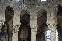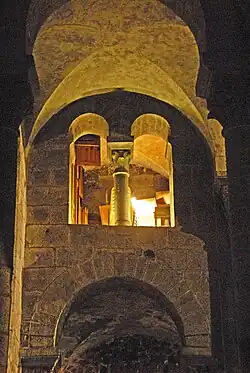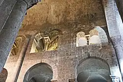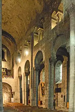 Wie bei allen Kirchen dieses Typus wird das Tonnengewölbe des Mittelschiffs von halben Tonnengewölben über echten Tribünen der Seitenschiffe gestützt. Diese Gewölbe werden zwischen den Jochen von Arkaden getrennt. Vom Mittelschiff öffnen sich zu den Tribünen zentriert über den Arkadenbögen der Scheidewände Biforien, deren Brüstungen ein Stück über den Arkadenscheiteln angeordnet sind. Ihre scharfkantigen runden Bögen, die mit pflanzlich skulptierten Kapitellen, profilierten Kämpfern und Basen ausgerüstet sind, reichen mit ihren Scheiteln knapp unter die Gewölbeansätze. Die Ansätze ihrer äußeren Bögen werden von Kämpferprofilen markiert.