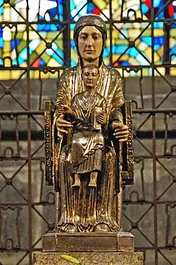 Die Gesichter sind nicht Blattgold, sondern farbig gefasst. Trotz ihrer Frontalansicht weist das strenge Gesicht seltsamerweise asymmetrische Züge auf. Von ihrer linken Seite aus betrachtet wirkt sie etwas bäuerlich, von der Rechten hingegen wie eine vornehme Dame. Der Jesusknabe hält das Buch der Evangelien und sitzt auf den Knien seiner Mutter. Ikonographisch entspricht die Skulptur dem Typus Sedes sapientiae, Maria als Thron der göttlichen Weisheit.