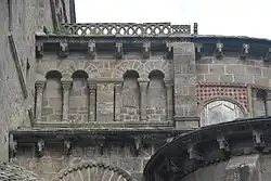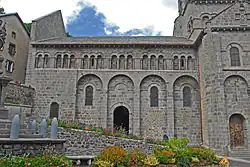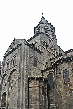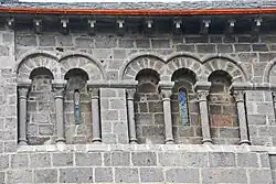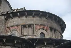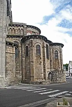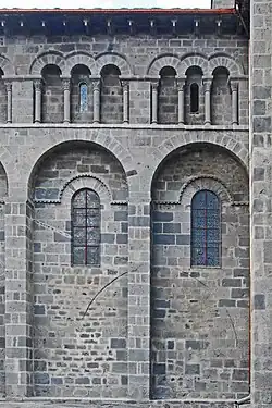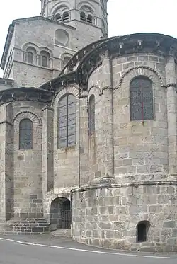 In der Rundung der Chorapsis sind in radialer Anordnung jeweils in den Achsen der Kapellen vier rundbogige Fenster ausgespart, deren Bogenansätze nur knapp über dem First des umlaufenden Pultdachs angeordnet sind. Der untere Teil der Fenster verschwindet unter diesem Dach. Damit aber ihre ganze Höhe zur Belichtung des Chorraums genutzt werden kann, hat man wohl in der Neuzeit in den Dachflächen unmittelbar vor den Fenstern und in deren Breite geneigte Glasflächen eingebaut. Die Keilsteinbögen der Fenster werden außen von einem Kragprofil mit einfachem Rollenfries überfangen, das in Höhe der Bogenansätze waagerecht auswärts abschwenkt und knapp über dem Pultdachfirst bis zum nächsten Bogen und dann weiter um den ganzen Chor herum bis gegen die Querhauswand geführt wird. Die gekrümmte Apsiswand wird etwa in halber Höhe zwischen dem vorgenannten Profil und der Unterkante der Kragsteine der Chortraufe mit dem gleichen Profil umschlossen, das an den beiden Strebepfeilern endet. Die Fläche über dem Profil besteht aus Mauerwerk, das auch zwischen den Kragsteinen hochgeführt ist. Zwischen den beiden waagerechten Kragprofilen sind im Wechsel zwei verschiedene Gestaltungsstrukturen verwendet worden. Zwischen den Keilsteinbögen der Fenster hat man mit senkrechten Kragprofilen drei liegende Rechtecke abgeteilt, in denen gleich große Nischen zurücktreten. Diese sind wiederum mit drei Säulchen in zwei Felder unterteilt. Sie sind mit schlicht skulptierten Kapitellen, profilierten Kämpfern und Basen ausgerüstet. Dieses Motiv ist eine Anleihe aus der römischen Antike. Außerhalb der Hauptkirchen trifft man das Motiv nur noch einmal an der nicht weit entfernten, runden Friedhofskapelle Chambon-sur-Lac an. Die übrigen vier Abschnitte, jeweils oberhalb der Keilsteinbögen der Fenster, sind mit Inkrustationen gefüllt, aus einem rosafarbenen diagonalen Gitter, das kleine quadratische Felder abteilt, die mit im Wechsel schwarzen und weißen Tafeln ausgelegt sind.