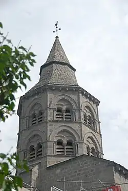 Auf dem kaum noch sichtbaren Turmsockel ragt mit nahezu gleichem Umriss der zweigeschossige Glockenturm hinauf. Seine Architektur wurde nach dem heftigen Erdbeben von 1478 geändert. Es gab damals durchaus heute noch gut erhaltene Glockentürme, die man hätte zum Vorbild nehmen können, wie etwa der von Saint-Saturnin. Die beiden Geschosse sind gleich hoch und alle Achteckseiten sind nahezu gleichförmig gestaltet. Auf jeder der acht Ecken stehen dreiviertel runde schlanke Säulchen, die in Höhe der Geschossteilung mit skulptierten Kapitellen getrennt sind und ganz oben unter Kragsteinen mit ebensolchen enden. Unmittelbar auf den Kraggesimsen stehen große Blendarkaden mit angespitzten Rundbögen. Deren Keilsteinbögen werden außenseitig von Kragprofilen überfangen, die in unmittelbarem Kontakt mit den Ecksäulchen auf Kämpferprofilen stehen. Die inneren Laibungskanten der Bögen sind im ersten Geschoss mit Hohlkehlen gebrochen, in die in unterschiedlichen Abständen kugelförmige Steinperlen eingefügt sind. Im Geschoss darüber sind diese Kanten in Rundstäbe aufgelöst. Die Keilsteinbögen stehen auf kurzen Wandstücken und auf Säulchen mit schlicht gestalteten Kapitellen und profilierten Kämpfern. Diese werden auswärts über die Eckpfeiler und deren Säulchen hinweg geführt. Im Nischenhintergrund der großen Arkade sind Paare von kleinen rundbogigen Arkaden ausgespart, deren Keilsteinbögen auf drei Säulchen stehen, die wie vorstehend ausgerüstet sind. Durch die schräg gestellten Klanglamellen sind sie als Klangarkaden zu erkennen. Die Bogensteine werden von Kragprofilen überfangen. Ihre Innenkanten sind im ersten Geschoss scharfkantig, im oberen mit Hohlkehlen gebrochen, in die Steinperlen eingelassen sind. Das zweite Geschoss wird oberseitig von Traufgesimsplatten auf Hobelspankragsteinen abgeschlossen, wie sie bei den übrigen Dächern zu finden sind.