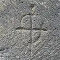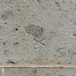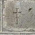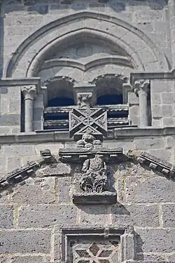 Im Giebelfeld des südlichen Querhausarms ist knapp über der Traufattrappe ein großes lateinisches Kreuz mit breiten Armen aufgebracht, dessen Ränder von kräftigen Kragprofilen eingefasst sind. Die Innenflächen des Kreuzes sind von so genannten Inkrustationen bedeckt, das sind Steinmosaike aus meist weißen und schwarzen Steinplättchen, zu verschiedenen geometrischen Mustern zusammengestellt. Ihre Ursprünge sind keineswegs orientalisch, sondern gallorömisch oder frühchristlich. Hier sind es Rosetten in Kreisen aus schwarzem, weißem und grauem Material. Solche Inkrustationen finden sich an fast allen Kirchen in der Auvergne. Unter dem gekappten First des Giebelfeldes ragt ein seltsames Gebilde aus einem Blattfächer hervor, der aus einem Kragprofil wächst. Es könnte vielleicht eine Maske sein. Darüber befindet sich ein stilisiertes Tatzenkreuz (?), dessen weit aufgefächerte Arme von einer Kreisscheibe gehalten werden. Im Zentrum gibt es einen kleinen Kreisring mit einem Lazaruskreuz, auch Kleeblattkreuz genannt. In den dreieckigen Kreuzarmen sind Blattfächer, aus denen Knospen oder Pinienzapfen sprießen, dargestellt. (vergleiche Tatzenkreuz von Notre-Dame-du-Port de Clermont-Ferrand)