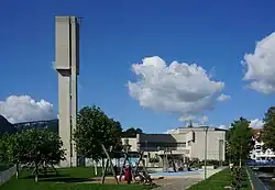 Die ganze Anlage basiert auf rechtwinkligen Flächen und Kuben, die sich in der Höhe zum Chorbereich der Kirche proportional steigern. In der südöstlichen Ecke des Grundstücks steht auf drei Betonstützen der 32 Meter hohe Glockenturm. Von dort sind die drei würfelartigen 4, 8 und 12 Meter hohen Betongebäude diagonal, nordwestlich zum Chor ausgerichtet. Seitwärts angefügt sind einerseits die Marienkapelle mit der Orgelempore und gegenüber die Werktagkapelle. Vom weiten Vorplatz gelangen die Besucher zum von Armin Hofmann entworfenen Grundstein am aufstrebenden Eckpfeiler und betreten durch die links und rechts von der Taufkapelle angeordneten Eingänge die Kirche.