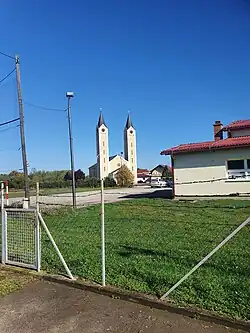 Die Kirche von Novo Selo, am rechten Bildrand ein Teil der Schule
