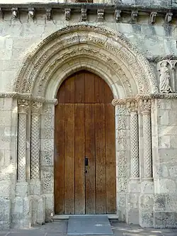 Über der Südfassade erhebt sich der rekonstruierte Glockengiebel (espadaña) mit zwei großen Rundbogenöffnungen. In der Mitte der Fassade öffnet sich ein Rundbogenfenster, das von Archivolten und schlanken Säulen mit Kapitellen gerahmt wird. Ein Gesims, das auf skulptierten Kragsteinen aufliegt, bildet den oberen Abschluss des Portals. Dieses ist von leicht zugespitzten, mit Blattmotiven versehenen Archivolten und Säulen eingefasst, deren Schäfte mit Flechtbändern verziert sind. Auf den Kapitellen sind zu Voluten gerollte Blätter dargestellt und wie auf den Reliefplatten des Gewändes von Blattranken umschlungene Personen. An der rechten Seite des Portals, auf der Höhe des Ansatzes der Archivolten, wird die Verkündigung an Maria durch den Erzengel Gabriel dargestellt.