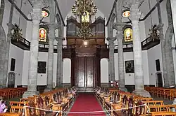 Der Innenraum besteht aus drei großen Schiffen und sechs Seitenkapellen, drei auf jeder Seite. Die Kapellen werden durch Mauern abgetrennt, die das Gewicht des Gewölbes aufnehmen. Der Altarraum hat die gleiche Höhe wie das Hauptschiff. Hinter dem Altarraum schließt sich ein weiteres, ebenso großes Joch für den Chor an, der sich, vom Hauptschiff aus kaum sichtbar, hinter dem Tabernakel befindet. Die Kuppel wird von vier Säulenbündeln getragen, die auf der Seite des Altarraumes mit der Wand verbunden sind. Diese Säulenbündel besitzen korinthische Kapitelle. Über diesen Kapitellen befinden sich Gebilde in der Form einer umgekehrten Pyramide, auf denen weitere Pfeiler folgen. Es handelt sich hierbei um die Anpassung des bereits bestehenden Säulensystems an die veränderten Bauvorgaben, die ein Tonnengewölbe und eine Kuppel vorsahen. Das Hauptschiff und die Seitenschiffe schließen nach oben mit einem Tonnengewölbe ab. Die Kuppel wird durch 16 Rippen mit entsprechenden Füllflächen gebildet. Sie endet in einer Laterne, die acht mit Halbrundbogen abschließende Fenster enthält.