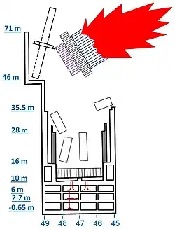 Nun zeigte sich ein weiterer Konzeptionsfehler des Reaktortyps: Durch die an den Spitzen der Stäbe angebrachten Graphitabschnitte wurde beim Einfahren eines vollständig herausgezogenen Stabs die Reaktivität dort kurzzeitig erhöht, bis der Stab tiefer in den Kern eingedrungen war.[18] Dadurch entstand unten im Reaktor ein Bereich, in dem die Leistung die Auslegung der Struktur überschritt – das erhitzte Metall dehnte sich aus und blockierte ein weiteres Einfahren der Steuerstäbe.