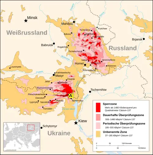 Nachdem Prypjat am 27. April 1986 evakuiert worden war, erfasste der nächste Evakuierungs-Schritt bis zum 3. Mai sämtliche Einwohner aus einem Umkreis von 10 km um den Reaktor. Am 4. Mai 1986 wurde ein Gebiet 30 km um den Reaktor evakuiert, davon waren weitere 116.000 Menschen betroffen. Der größte Teil der Evakuierungen wurde von den Reserven der Sowjetarmee durchgeführt. In den folgenden Jahren wurden nochmals 210.000 Einwohner umgesiedelt. Mittlerweile beträgt die Sperrzone 4300 km²,[32] was einem Kreis mit dem Radius von 37 km entspricht.