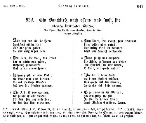 - ↑ Helmut Lauterwasser: 320 Nun lasst uns Gott dem Herren. In: Wolfgang Herbst, Ilsabe Seibt (Hrsg.): Liederkunde zum Evangelischen Gesangbuch (= Handbuch zum Evangelischen Gesangbuch. Band 3). Heft 16. Vandenhoeck & Ruprecht, Göttingen 2011, ISBN 978-3-525-50302-7, S. 27–34, hier S. 32 ff.