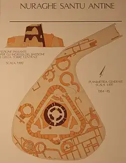 - Stark beschädigt, die zentrale Zelle hat hier etwa 4,12 m Durchmesser und ca. 4,50 m Höhe (rekonstruiert). Hier gab es auch einen Zugang zur umschließenden, vorkragenden Terrasse. Diese ist bei keiner Nuraghe erhalten geblieben, wird aber durch die gefundenen Kragsteine und die Modelle bewiesen.