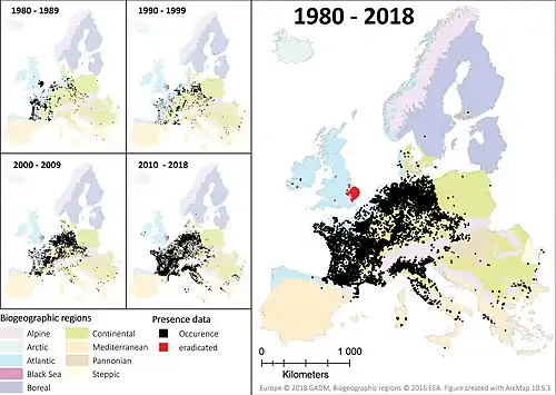 Entwicklung der europäischen Populationen ab 1980 – Die in vorausgegangenen Jahrzehnten festgestellten Bestände sind in Grau dargestellt. Rot kennzeichnet ausgerottete Populationen.
