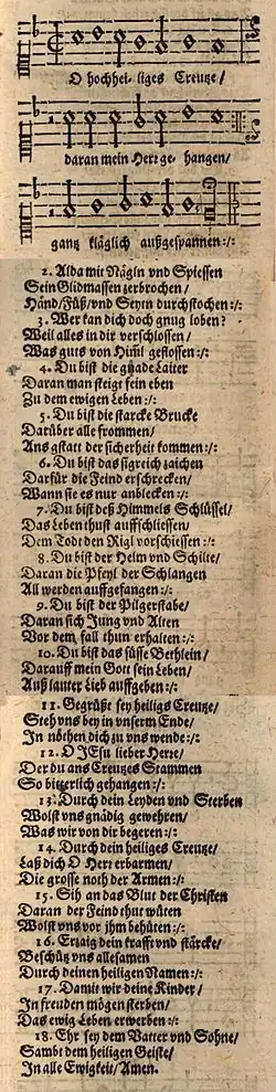 Aus den sieben Strophen von 1600 waren 1631 schon 18 geworden. Die ersten drei – die auch die Gotteslobfassung eröffnen – erinnern, in Anrede an das Kreuz, die Passion Jesu und bekennen in Form einer rhetorischen Frage die Unmöglichkeit, die Heilsbedeutung des Kreuzes „genug [zu] loben“. Daran schließt sich eine prinzipiell unabschließbare Reihe von Bildern für diese Heilsbedeutung an (Strophen 4–10): „Du bist“ Leiter, Brücke, Siegeszeichen, Himmelsschlüssel, Helm und Schild,[1] Pilgerstab, süßes Bett.[1] Nach einem erneuten Gruß an das Kreuz und Bitte um Hilfe in der Sterbestunde (Strophe 11)[1] folgt ein an Jesus selbst gerichtetes Gebet um Schutz im Leben und im Sterben mit Fürbitte für die Armen[1] und – Reflex der Türkenkriege – für die verfolgten Christen[1] (Strophen 12–17). Von diesem Jesusgebet finden sich die letzten beiden Strophen auch in der Gotteslobfassung, hier jedoch weiterhin an das Kreuz gerichtet.[2]