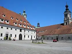 Der Meierhof des Stiftes St. Florian wurde von 1676 bis 1685 unter Propst David Fuhrmann errichtet. Das Gebäude stellt architektonisch einen doppelten Vierkanthof dar. Die Außenabmessung beträgt 84 × 71 Meter, der Wirtschaftstrakt hat eine Dachhöhe von 19 Metern und die beiden Innenhöfe sind jeweils etwa 2.500 Quadratmeter groß. Im Erdgeschoß waren die Stallungen und darüber die Getreidekammern und Futterlager untergebracht. Das Gebäude galt jahrhundertelang als eines der bedeutendsten wirtschaftlichen Bauwerke in Oberösterreich. Es diente dem Stift bis in die 1950er-Jahre für verschiedene stiftseigene Wirtschaftsleistungen. 1885 beherbergte der Hof 60 Personen, 36 Pferde und 150 Kühe.[15]