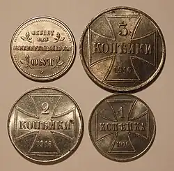 Trotz der knappen Ressourcen während des Krieges verfolgte Ober Ost eine umfassende Kulturarbeit. Diese zielte auf eine Disziplinierung und Manipulation der Bevölkerungsgruppen ab. Deutsche Soldaten und Offiziere im Land spielten die Rolle der Organisatoren. Die Einheimischen sollten lediglich die Ausführenden der sogenannten Deutschen Arbeit sein. Die Publikation von Zeitungen unter strenger Zensur, Schulpolitik, Theater und Ausstellungen zur Archäologie, Geschichte und Religion bildeten hierbei die Schwerpunkte der deutschen Anstrengungen. Für das Gebiet Ober Ost wurden auch eine eigene Währung Oberost-Mark oder Ost-Mark und den Ost-Rubel (die das Kriegsende überdauerten)[5] sowie eigene Aufdruck-Briefmarken herausgegeben und dort verwendet.[6] Als Münzen wurden 1, 2 und 3 Kopekenstücke aus Eisen mit der Jahreszahl 1916 geprägt. Die Währungsbezeichnung auf der Wertseite war in russischer Schrift in einem eisernen Kreuz, die andere Seite auf Deutsch mit den Worten „Gebiet des Oberbefehlshabers Ost“ beschriftet.[7]