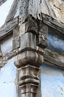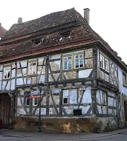 Das Fachwerkgefüge der zwei Fachwerkstöcke ist einfach gestaltet, nur mit dem Fränkischen Mann und einem Andreaskreuz über einer Raute als Zierform versehen. Bemerkenswert ist am unteren Eckständer die ausladende Konsole mit Wulsten, Kehlen und Leisten, die als Stütze für die überblattenden Wandrähme und die darüber liegenden Stich- und Gratstichbalken dient.