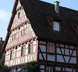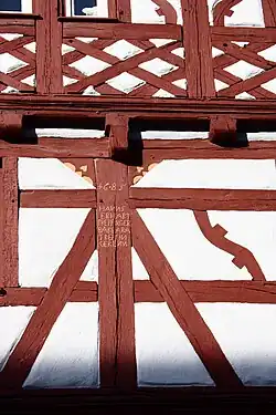Der Grundriss ist wie damals üblich einmal längs und zweimal quer geteilt. Der obere Fachwerkstock und die drei Dachstöcke kragen jeweils vor. Das Satteldach ist mit Biberschwänzen gedeckt. Die Zierformen des Straßengiebels sind besonders zahlreich in den Dachstöcken mit Andreaskreuzen über liegenden Rauten bzw. über Kreisen. An den Fachwerkstöcken sehen wir Kopfwinkelknaggen beim Fränkischen Mann mit vertieften Augen und Kreissegmenten. Alle Stockwerke haben geschweifte Streben mit Nasen.