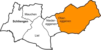 Zu Obereggenen gehören die Wohnplätze Blauenhaus,[3] Schloss Bürgeln[4] und Lippisbacherhof,[5] und Schallsingen[6]. Außerdem befinden sich auf der Gemarkung die abgegangene Wohnplätze (Wüstungen) Am Brenntenbuck,[7] Bützihoff (Bitzehof),[8] Gorgendorf[9] und Grüneck.[10]