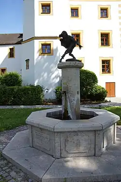 Vor dem Schloss steht auf dem Brunnen das gegossene Abbild eines Moriskentänzers und erinnert an den Schmidmühler Bildhauer Erasmus Grasser, der die berühmten spätgotischen Moriskentänzer für den Festsaal im Alten Rathaus zu München geschaffen hat. Die Garteneinfassung besteht aus roten Sandsteinpfeilern und stammt aus dem Ende des 18. Jahrhunderts.