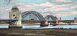 Die erste Oberkasseler Brücke wurde 1896 bis 1898 im Auftrag der Rheinischen Bahngesellschaft AG und auf Initiative und durch Finanzierung der Rheinbahngründer Heinrich Lueg, Franz Haniel junior, Friedrich Vohwinkel und August Bagel „der Jüngere“ als Teil der K-Bahn gebaut und am 12. November 1898 eröffnet.[7] Ihre beiden großen Eisenfachwerkbögen mit jeweils rund 181 Metern Spannweite und die vier kürzeren Bögen über der Düsseldorfer Rheinwerft und dem flachen Oberkasseler Ufer wurden durch den Ingenieur Reinhold Krohn geplant und von der Gutehoffnungshütte in (Oberhausen-) Sterkrade ausgeführt. Die beiden historistischen Tortürme und die Aufbauten des Mittelpfeilers mit der Figur des rheinaufwärts blickenden Bergischen Löwen sowie das Brückengeländer hatte der Düsseldorfer Architekt und Maler Adolf Schill entworfen, seit 1880 Professor für Dekoration und Ornamentik an der Kunstakademie Düsseldorf.[8] Die Portale waren nicht nur wichtige Blickpunkte der Luegallee und des ungefähr parallel zum Brückenbau vorgeschobenen Rheinufers, sondern gleichzeitig auch Stationen zur Entrichtung der anfänglich erhobenen Brückenmaut. Alle massiven Bauteile wurden durch die Bauunternehmung Philipp Holzmann & Cie. GmbH ausgeführt. Die Baukosten betrugen rund sechs Millionen Mark. Um auf dem östlichen Rheinufer das Portal und die Brückenauffahrt anlegen zu können, wurde der dort gelegene Sicherheitshafen zugeschüttet. Dies konnte geschehen, weil am 30. Mai 1896 erste Anlagen des heutigen Hafens an der Lausward eröffnet worden waren.