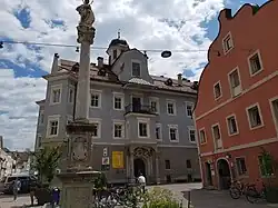 Der ansehnliche dreigeschossige Bau zeigt an der Schmalseite einen Eckerker und an der Oberragener Langseite einen zweigeschossigen polygonalen Erker über der gerahmten Schulterbogentür. Ein Wandbild mit Madonna und heiliger Dreifaltigkeit stammt aus dem Jahr 1706. Im Inneren gibt es eine kreuzgratgewölbte Labe und im ersten und zweiten Stock jeweils einen Raum mit Kassettendecke und Pilastergetäfel aus dem 17. Jahrhundert. In den Mittelfeldern sind Malereien zu sehen.