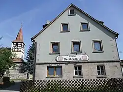 Wirtshaus in Oberreichenbach, im Hintergrund St. Bartholomäus