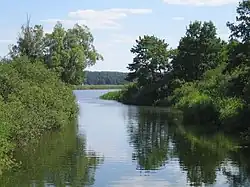 | Blick vom Westufer, im Hintergrund das Dorf Warnitz | ||
