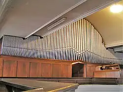 Auf der Empore der Kirche befand sich eine verhältnismäßig stattliche Orgel mit 19 Registern zuzüglich dreier Extensionen und einer Windabschwächung. Das Instrument wurde im Jahr 1937 als Opus 488 der Firma Gebr. Späth Orgelbau aus Ennetach unter Verwendung von älteren Teilen der Firma Roethinger erbaut. Im Jahr 1970 wurde durch Hugo Mayer ein Krummhorn im II. Manual ergänzt. Da im vorhandenen Schwellgehäuse kein Platz mehr vorhanden war, wurde um das Krummhorn ein eigener kleiner Schwellkasten gebaut, der synchron mit dem Hauptschweller gesteuert wurde. Der Freipfeifenprospekt war exakt in den Verlauf der Decke angepasst. Die Orgel besaß sowohl Kegel- als auch Taschenladen. Nach der Schließung des Klosters wurde die Orgel nach Polen verkauft. Heute befindet sie sich in der Pfarrkirche Sw. Idziego in Choceń. Beim dortigen Einbau bekam die Orgel einen völlig neu arrangierten Prospekt, der an die neue Kirche angepasst worden war. Inwiefern weitere Änderungen am Instrument vorgenommen wurden, ist zurzeit nicht bekannt. Das Instrument besaß (am Standort Saarbrücken) folgende Disposition:[4][5]