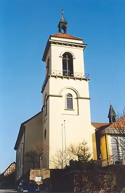 - Die evangelische Friedenskirche überragt auf der Alter Berg genannten Anhöhe die Ortsmitte. Direkt bei der Kirche befand sich einst die Alte Burg, von der sich Steine in den Stützmauern bei der Kirche erhalten haben.