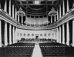Das Odeon wurde 1826–1828 durch Leo von Klenze errichtet. Es wurde als bürgerlicher Konzert- und Ballsaal genutzt. Die Fassade zum Odeonsplatz wurde aus Gestaltungsgründen spiegelbildlich zum vom selben Architekten entworfenen Palais Leuchtenberg ausgeführt, so dass seine Funktion von außen nicht ablesbar war. Der Saal hat eine halbrunde Exedra für das Orchester und übereinander gestellte Säulenreihen. In zehn Rundnischen hinter der Exedra befanden sich von Johannes Leeb geschaffene Büsten der nach damaligem Verständnis bedeutendsten Komponisten der Musikgeschichte (Beethoven, Mozart, Gluck, Händel, Haydn, Vogler, Méhul, Weber, Cimarosa und Winter).[1] Die Decke zierten Fresken im Nazarenerstil, und zwar Apollo unter den Musen von Wilhelm Kaulbach, Apoll unter den Hirten von Adam Eberle und Das Urteil des Midas von Hermann Anschütz.[2] Bis 1985 diente der nach dem Krieg erbaute Herkulessaal in der Residenz den Zwecken, die zuvor das Odeon erfüllt hatte. Das Odeon war „eine der außergewöhnlichsten klassizistischen Lösungen der Bauaufgabe Konzertsaal“.[3]