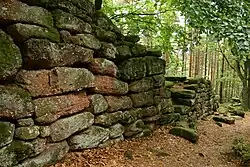 Um die Abhänge des Berges herum zieht sich die sogenannte Heidenmauer (frz.: mur païen), eine mehr als 10 km lange Schutzmauer, die lange für prähistorisch gehalten wurde. Aktuelle Untersuchungen (publiziert im Jahr 2003, dendrochronologisch und nach der C14-Methode) von wiederaufgefundenen Eichenholzklammern, mit denen die Steine der Mauer verbunden waren, datieren diese Klammern zweifelsfrei in das letzte Viertel des 7. oder das beginnende 8. Jahrhundert n. Chr.[1] Eventuell stammen sie aus einer Reparaturphase, denn eine so späte Entstehung der Gesamtanlage war bisher nicht ernsthaft in Betracht gezogen worden. Generell folgt die Mauer dem Auftreten der Konglomerate, aus der sie erbaut wurde, um den Transportaufwand der schweren Steinblöcke zu minimieren.